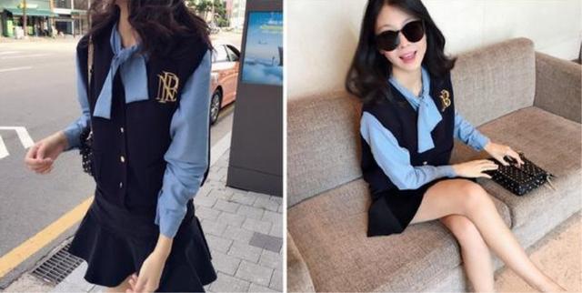 05.针织马甲+蓝色衬衫+黑色小短裙 单色系的针织马甲背心,一看就很范了,内搭一款清爽蓝色的衬衫,增添了一丝丝洋气的气息,下身搭配一条A字小短裙,拉高你的腰线延伸你下半身的线条,简单层次分明的搭配,也很显气质感哟。