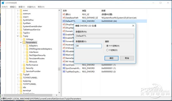 在运行命令框中输入注册表命令 如上图,确认之后进入注册表编辑器界面,首先我们依次选择HKEY_LOCAL_MACHINE,之后在选择HKEY_LOCAL_MACHINESYSTEMCurrentControlSetServicesTcpipParameters选择DefaultTTL,改变值为80(16进制)确定即可,如下图: