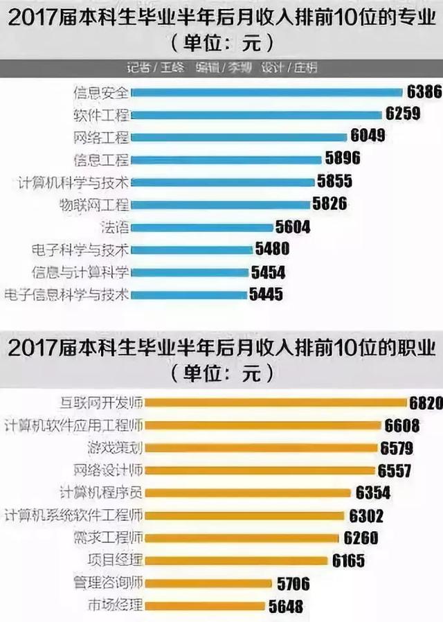 绿牌专业指的是失业量较小,就业率、薪资和就业满意度综合较高的专业。 红牌专业指的是失业量较大,就业率、薪资和就业满意度综合较低的专业。 需求最旺专业 教育 2017届本科毕业生毕业半年后就业最多的行业类是“教育业”,就业比例为14.7%,其中有六成左右集中在中小学教育机构。 2017届高职高专毕业生就业比例增长最多的也是教育业,其中就业于幼儿园与学前教育机构的占比上升较快,从2013届的25%上升到了2017届的33%。 创业最爱 教育、零售业 2017届大学毕业生毕业半年后自主创业的比例为2.9%,与前两届基本持平。2017届高职高专毕业生毕业半年后自主创业的比例高于本科毕业生。本科毕业生毕业半年后自主创业主要集中在教育产业。2017届高职高专毕业生毕业半年后自主创业主要集中在零售业。 同时,大学毕业生自主创业人群收入优势明显,毕业半年后自主创业人群的月收入为5785元,比2017届本科毕业生毕业半年后平均月收入高1011元。 收入最高 IT类职业 2017届大学毕业生的月收入为4317元,比2016届增长了329元。从近三届的趋势可以看出,大学毕业生毕业半年后月收入呈现上升趋势。从事IT类职业本科毕业生收入较高。