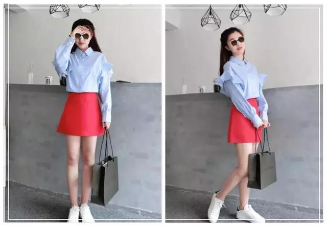 红色是一种百搭的颜色,适合多种人群哦。红色的格子半身裙,搭配白色的衬衫简直不要太完美了!整体呈现出一种很高级的感觉,Audrey感觉,红色搭配白色是最好看的,不接受反驳哦!这一身穿搭知性且优雅大方,穿起来很显气质魅力呢! 搭配02:浅蓝色韩版衬衣+红色半身短裙