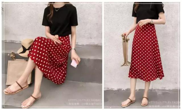 浅蓝色是一种非常好看的颜色,很有夏天的味道,更是一种十分显肤色显气色的颜色哦。浅蓝色的韩版花边衬衣,配上一条红色的高腰半身短裙,看起来减龄且具有青春气息,学生党可以这么穿。高腰的短裙更显腿长,红色和淡蓝色的色系搭配更显个性又独特。 搭配03:黑色短袖上衣+红色波点半身中长裙