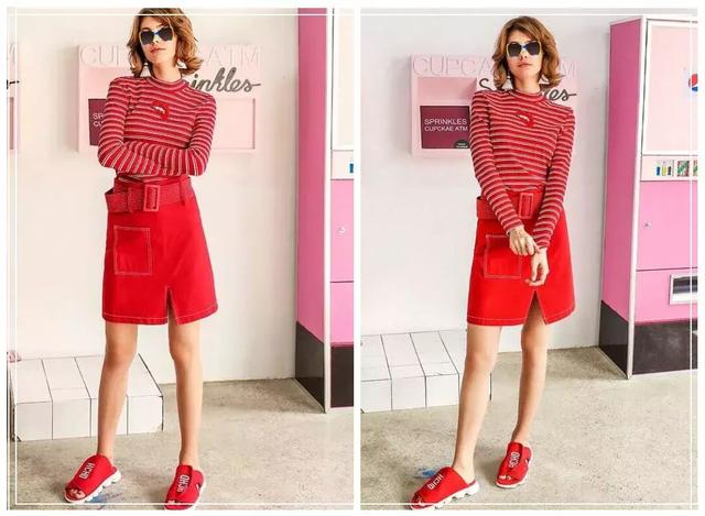 臧宝紫色看起来有着满满的高级感,穿起来很显气质又显气色呢!肤色白皙的妹子穿上简直不要太亮眼了,让你看起来更加白皙哦。这款臧宝紫色的长袖上衣,下身配上不规则的红色半身裙,显得优雅且大方,时尚感满满呢!臧宝紫色和红色搭配在一起,有着很强的视觉冲击力,许多时尚达人都很爱这样的色系搭配。 搭配05:红色条纹上衣+红色半身短裙