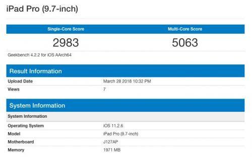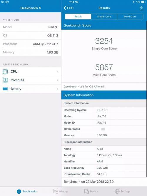 从这张对比表可以看出来, iPad 2018 在处理器上略有优势,从 GeekBench 上的跑分来看,A10 单核、多核跑分都比 A9X 要高出一截。