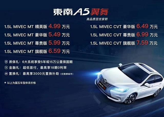 1. 东南这个汽车品牌国内的伙伴应该都比较熟悉了,今天为大家推荐的首款车型就是东南旗下的新款轿车,东南A5翼舞,这款车是东南汽车推出一款新车型,这款车的车身尺寸为4588mm*1780mm*2625mm,这样车身尺寸可以说已经非常的漂亮,可能有的伙伴说现在马上就是实施国六了,买国五不是亏了嘛,没事这款车提供了国六排放标准可以供大家选择,在原来的基础上只需要加价2000元即可让你提前进入国六时代。这款车目前搭载1.5L的自吸发动机匹配CTV无极变速箱,最大马力可以达到120匹马力,峰值扭矩为143牛米,作为日常代步车来说,这款车的动力已经完全足够了。起步价仅仅在4.99万,所非常符合很多伙伴的标准。另外在内饰方面这款车也毫不吝啬,运用了大量的软性质材料同时配置皮质座椅,让整体的舒适度更高一些。