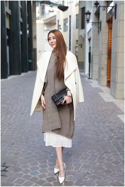 搭配要点:白色蕾丝打底裙+米白色宽松长款毛衣+棕色马丁靴+黑色挎包