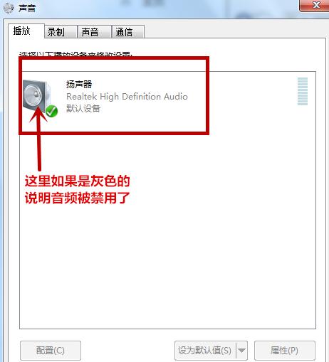 进入音频后,我们就可以看到,如果这里的扬声器是灰色的说明被我们禁用了,如果是亮色的说明是开着的,没问题。