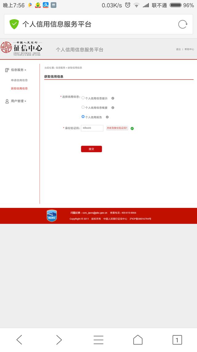 你要记住这个验证码,然后打开个人征信官网登陆输入此信息内的验证码获取你申请查询的个人征信报告,如下图: