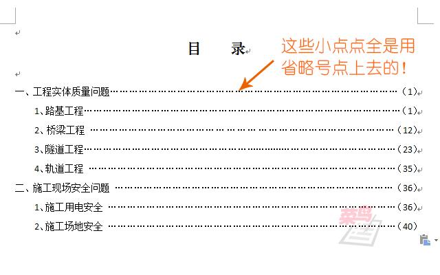 利用制表位构成的“隐形”表格 设置完制表位后,便可在“第2列”方便、整齐地输入页码了。光标怎么从“第1列”跳到“第2列”呢?通过键盘上最左边的“Tab”键便可。例如:第1行“工程实体质量问题”当光标在“题”字右边的时候,按一下“Tab”键,光标就会自动移动到制表位的位置,便可输入页码了。 输入完所有页码后,选中所有目录内容,点“段落”,再点“制表位”按钮,便可按照前面所的方法设置前导符的样式了。这个时候,你会发现,一次性便把小圆点设置好了。就是这么简单! 说到这里,大家也应该更明白前导符是什么东东了:前导符实际上就是制表位之间没有内容的部分用来填充空白的符号。 咱们最后再用动画来演示一遍:
