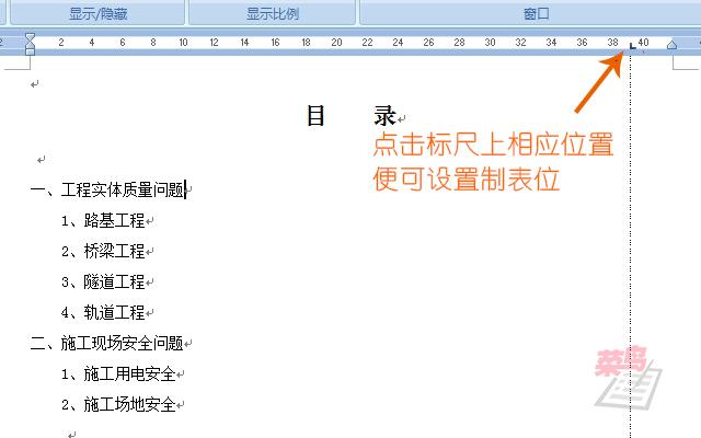 前导符的设置(以上是wps中的设置,word中的设置也完全一样,没有区别) 前导符的设置从“段落”设置界面左下角的“制表位”按钮点击进入,有5种样式。第1种是啥不不显示。咱们设置目录用的前导符,一般是用第5种,这一种样式的小圆点可爱些。如果你审美角度不一般,也可选择其他3种中的某一种。 当然这个时候选择前导符是不会有效果的。得要先设置好制表位。 说到这里,不得不再引出另一个概念:制表位。简单的说,制表位就是虚拟的表格,既可以让文字像在表格中一样按列对齐,又不会显示实际的表格。 因为目录中每一行的页码都是居右对齐的,用制表位可以在垂直方向排得非常整齐。比如,咱们准备让页码显示在标尺38至40之间的位置,就可以在标尺相应位置上点一下,点完后标尺上会出现一个“L”形的小标记,这就是制表位的位置了。如果位置没点正,可以拖动“L”标记进行调整,如果要取消这个制表位,直接将“L”标记往下拖离标尺便可。如下图: