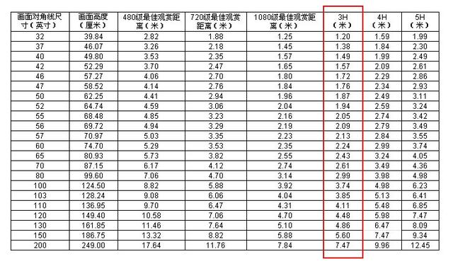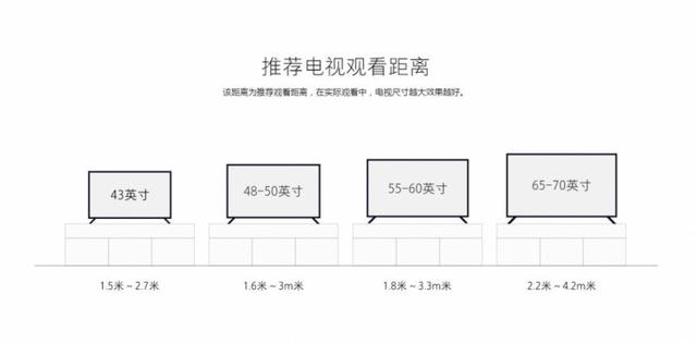 三星推荐的电视观看距离 很多电视在产品介绍页都会给出不同尺寸电视的最佳观看距离,不过它们的参考意义都不大。比如小米推荐的65-70英寸最佳观看距离是2.2-4.2米,这个距离大部分客厅环境都能满足,另外它还提示“该距离为推荐观看距离,在实际观看中,电视尺寸越大效果越好”,说白了还是直接往大了买。 三星给出的电视观看距离比较明确,比如55英寸电视的观看距离是3-3.5米,65英寸以上电视的观看距离在3.5米以上,这个数据是否值得参考呢? 其实网上有不少电视最佳观看距离的计算公式,最流行的是观看距离=液晶电视对角线距离×3。就拿55英寸电视来说,对角线距离是55×2.54(1英寸等于2.54厘米),最终算出的结果是4.19米,如果反过来计算,如果观看距离是3米,对应的电视屏幕尺寸约为39英寸,放在客厅里显然有点小,所以说这个公式放到现在并不适用。 在讨论电视尺寸与观看距离时,屏幕分辨率也应该被考虑进去。 电视屏幕的尺寸在不断增加的同时,分辨率也随之提升,4K已经全面普及,8K也已经在路上,清晰度越来越高,要保证更好的观看效果就需要不断拉近观看距离。 比如现在我们用55英寸4K电视看有线电视标清信号会明显发现图像的清晰度不高,同样的观看距离使用小尺寸电视却不会有这样的感受。 所以一个靠谱的最佳观看距离计算公式应该结合分辨率,下面这张表格的数据值得参考。最后三列3H、4H、5H中的“H”指的是电视屏幕的高度,可以看出3H与左侧的1080级数据非常接近,由于目前有线电视的高清信号及网络节目大多最高能达到1080P清晰度,可以根据这一列数据决定电视尺寸。