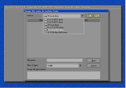 选择镜像文件所在的分区,我将影像文件cxp.GHO存放在E盘,所以这里选“D:1:4囗FAT drive”,按回车键确认之后找到自己所存放的镜像文件点击回车(一般*.ghost文件自己选择最明显了然的磁盘选择方便于查找。这里1:1 、1:2等差不多对应的就是C、D、E盘不用着急慢慢找到就可以了)显示如下