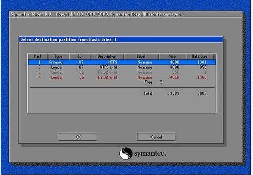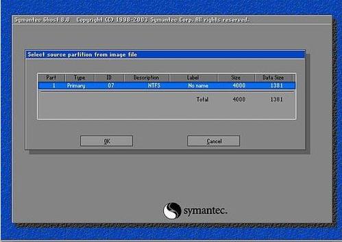 显示出选中的镜像文件备份时的备份信息(从第1个分区备份,该分区为NTFS格式,大小4000M,已用空间1381M)!确认无误后,按回车键,显示如下