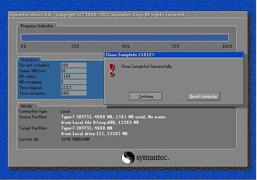 正在将备份的镜像恢复,完成后显示如下直接按回车键后,计算机将重新启动!启动后你就可见到效果了,恢复后和原备份时的系统一模一样,而且磁盘碎片整理也免了