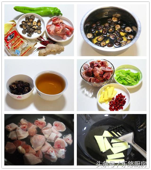具体制作方法 第一步:准备食材。鸡腿三个、干香菇一小把、青辣椒一个、姜一块、红辣椒适量。 第二步:香菇清洗干净,然后倒入适量的热水,浸泡三到五个小时,直到香菇全部泡发。 第三步:将泡好的香菇捞出来,泡发的水不要扔,留着备用。 第四步:鸡腿剁成块、青辣椒切成块、红辣椒切段、姜切片备用。 第五步:锅中倒入适量的清水,然后将鸡块放入锅中,再加入一勺料酒。大火烧开后,撇去浮沫,然后将鸡肉捞出备用。