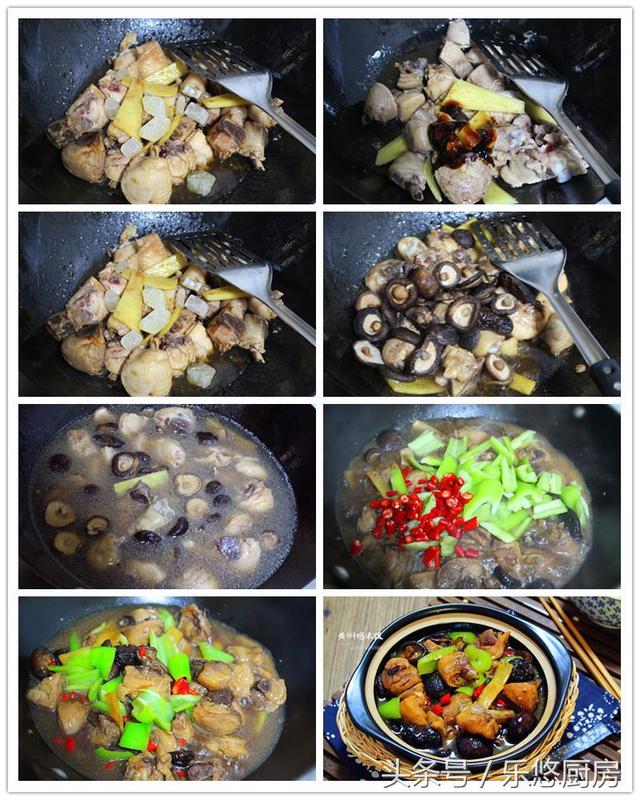 第六步:锅中倒入适量的食用油,油热后放入姜片煸炒出香味。 第七步:将鸡块放入锅中煸炒匀均。 第八步:加入一勺酱油,一勺蚝油煸炒匀均。 第九步:往锅中放入一小把的黄冰糖,然后翻炒匀均。 第十步:将香菇放入锅中煸炒匀均。 第十一步:将泡发香菇的水倒入锅中,再放少许盐调味。然后盖好锅盖,大火烧开后,转小火炖二十分钟左右,关火后再焖十分钟。