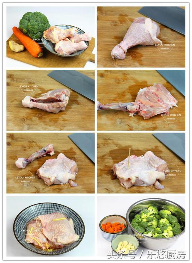 具体制作方法 第一步:准备食材。鸡腿3个、西兰花适量、胡萝卜适量、姜适量、蒜适量、照烧汁适量。(照烧汁在京东或者天猫超市都可以买得到,很方便。) 第二步:开始处理鸡腿。用刀将鸡腿的脚踝处切断,露出骨头,如图。 第三步:再竖的切一刀,露出鸡骨头。 第四步:沿着骨头把鸡肉剥下来,遇到有筋的地方可以用刀切断,如图。 第五步:把顶部剩余的地方切断。如图,骨头和肉就完全分离了。