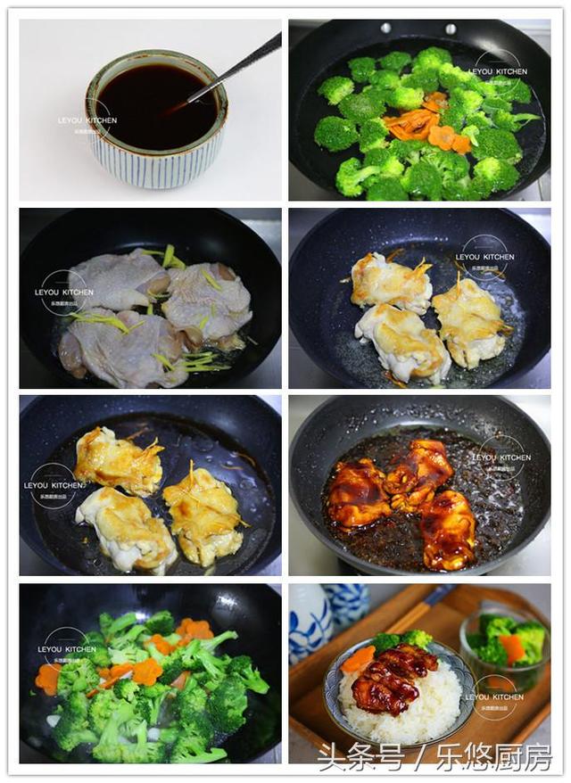 第十四步:烧至照烧汁浓稠,鸡肉熟透即可关火,如图。 第十五步:锅中倒入适量的油,油热后把蒜片放入锅中煸炒出香味,再把焯过水的西兰花、胡萝卜片放入锅中煸炒均匀,然后放入1勺盐、半勺鸡精调味,再次翻炒均匀即可关火。 第十六步:盛一碗米饭,放上切好的照烧鸡腿肉和蔬菜,淋一些照烧汤汁,即可开动了。 第三道:粟子烧鸡 这道栗子烧鸡,鸡肉鲜滑、板栗香甜、汁浓醇厚、色泽红亮,有补脾胃、强筋骨的功效,是非常营养又下饭的一道家常菜。