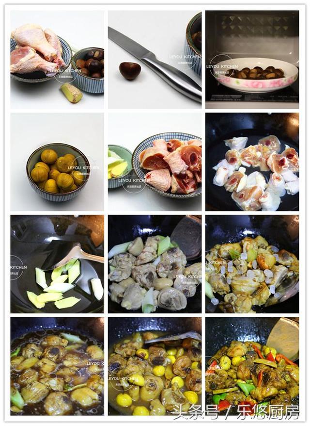 具体制作方法 第一步:准备食材。鸡腿4个、新鲜栗子150克、葱1段、姜1块、红绿辣椒适量。(做这道菜,可以用整鸡或者鸡腿、鸡翅什么的,随自己喜好来就可以。) 第二步:先来给栗子去皮。用刀在栗子上边划一个小口。(一定要将表皮划破) 第三步:将所有划好口的栗子放入微波炉中,高火加热1分钟。(1分钟即可,时间不用太长。) 第四步:栗子晾凉后即可轻松把皮剥掉了。 第五步:将鸡腿剁成块、葱姜切片、红绿辣椒切块备用。