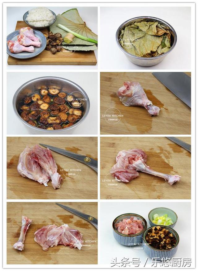 具体制作方法 第一步:准备食材。糯米饭1大碗、鸡腿3只、干香菇50克、干荷叶几张、姜适量、葱适量。 第二步:把荷叶提前用热水泡软,然后清洗干净备用。 第三步:把干香菇提前泡发。 第四步:开始处理鸡腿。以下给大家介绍一种鸡腿快速去骨的方法。用刀将鸡腿的脚踝处切断,露出骨头,如图。 第五步:从开口处用剪刀贴着骨头,将肉剪开。