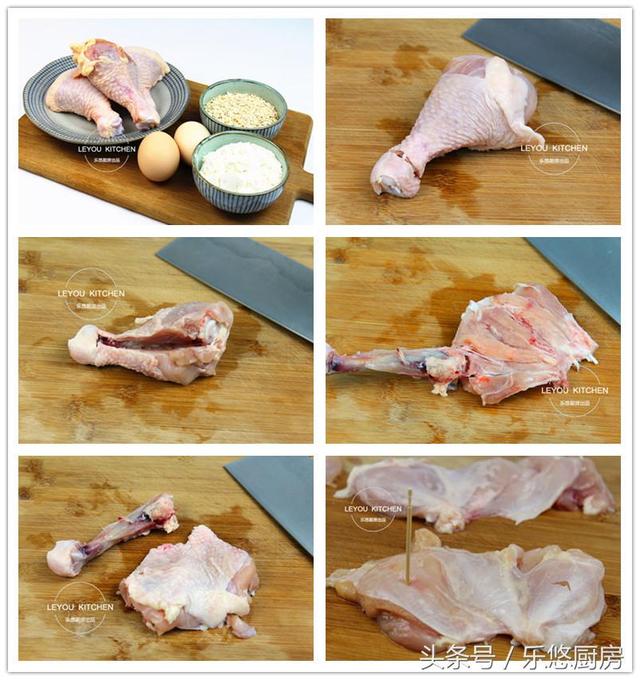具体制作方法 第一步:准备食材。鸡腿3个、面粉适量、鸡蛋2个、燕麦片适量。 第二步:开始处理鸡腿。用刀将鸡腿的脚踝处切断,露出骨头,如图。 第三步:再竖的切一刀,露出鸡骨头。 第四步:沿着骨头把鸡肉剥下来,遇到有筋的地方可以用刀切断,如图。 第五步:把顶部剩余的地方切断。如图,骨头和肉就完全分离了。