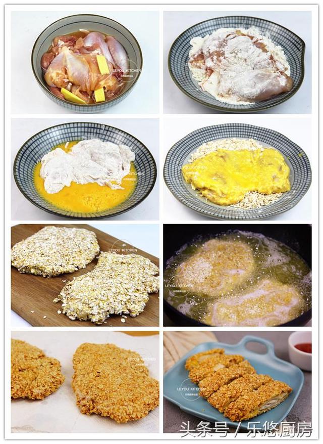 第六步:把鸡皮撕下去,然后用牙签在鸡肉上扎一些小孔,如图。(这样更便于入味。) 第七步:把鸡肉放到一个大碗里,再放入1勺料酒、几片姜、1勺盐、1勺白糖、少许白胡椒粉,用手抓匀后,腌制30分钟。(要让肉的每一处都粘满料汁,这样才能入味。) 第八步:腌好后把肉取出,放到面粉中,让肉表面粘满面粉。 第九步:把鸡肉放到打散的蛋液中,让其表面蘸满蛋液。 第十步:把蘸满蛋液的鸡肉放入燕麦片中,边粘边用手按压,让燕麦片紧紧的粘在鸡肉上。 第十一步:如图,粘好燕麦片的样子。 第十二步:往平底锅里倒入适量的食用油,油温五六成热的时候,把鸡排放入锅中,中小火开始炸制,炸至一面定型后翻面,直到双面金黄,成熟。