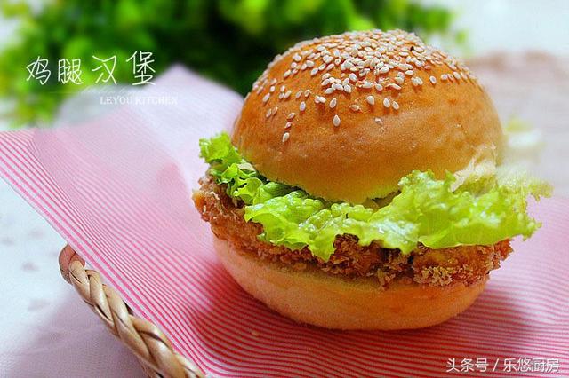 第十三步:将炸好的鸡排捞出,放到厨房纸巾上,把表面的油分吸一下。 第十四步:切块食用吧~ 多说几句: 1、燕麦片一定要选用即食的那种,如果颗粒比较大,可以提前放到保鲜袋中,辗碎一些。 2、我用的是鸡腿肉,吃起来比较鲜嫩多汁,亲们也可以换成鸡胸肉来做。 3、可以用烤箱来烤,把烤箱下上火180度预热,然后把刷好油的鸡排放入烤箱中,烤20分钟即可。这样烤好的鸡排更省油,也更健康。 第七道:鸡腿汉堡 在家做洋快餐其实特别简单,喜欢的亲们一定要试试看~