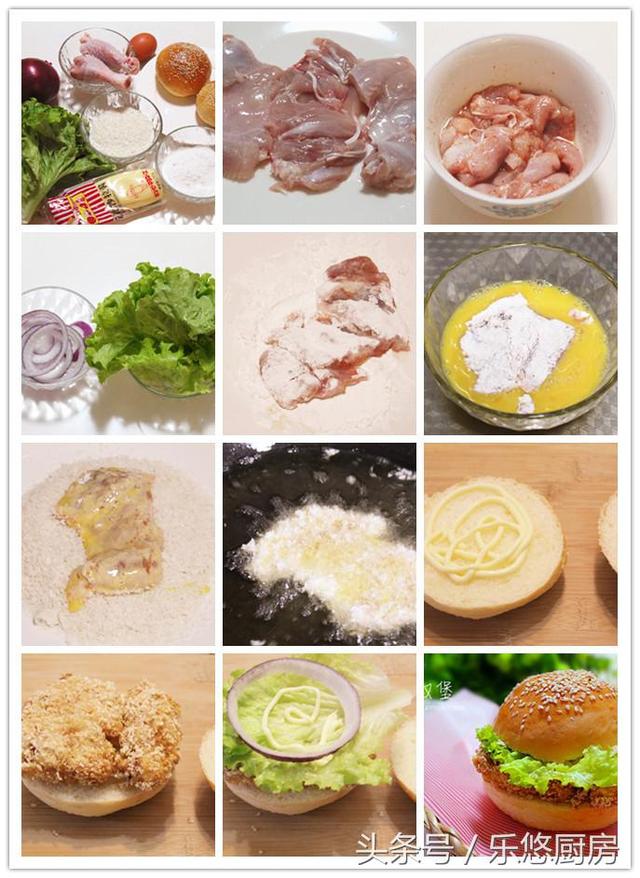 具体制作方法 第一步:准备食材。面包汉堡胚两个、鸡腿两个、生菜一根、洋葱适量、面包糠适量、玉米淀粉适量、鸡蛋一个、沙拉酱适量。 第二步:将鸡腿的骨头剔除,皮去掉备用。 第三步:用盐、鸡精、干辣椒粉、料酒、糖把鸡腿肉腌制两个小时。 第四步:将洋葱切成圈、生菜撕成块、鸡蛋打散备用。 第五步:取一块腌好的鸡腿肉,表面匀均的拍上一层玉米淀粉。