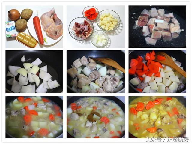 具体制作方法 第一步:准备食材。鸡腿两个、土豆两个、胡萝卜1根、洋葱半个、葱1段、咖喱块适量、牛奶20毫升。(也可以用咖喱粉,效果是一样的。值得一提的是,不同品牌的咖喱味道稍有不同,最好是按照包装上的用量来放) 第二步:将鸡腿剁成块、土豆切块、胡萝卜切块、洋葱切块备用。 第三步:锅中倒入适量的水,然后将鸡肉放入锅中,再放入一截葱。大火烧开后,再煮2分钟,然后将鸡肉捞出备用。 第四步:锅中倒入适量的食用油,油热后将洋葱放入锅中煸炒10秒。