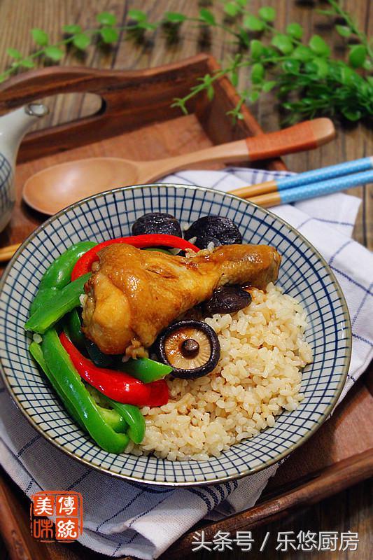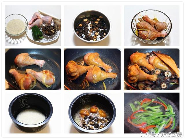 具体制作方法 第一步:准备食材。大米适量、鸡腿3个、干香菇适量(也可以用新鲜的香菇,但干香菇的味道更好一些)、姜1小块、葱1段、青椒1个(青椒属于配菜。配菜也可以按照自己的喜爱换成别的蔬菜)。 第二步:干香菇提前泡发。(干香菇泡发方法:将香菇清洗干净后放入温水盆中泡软,然后再用手朝一个方法轻轻的搅动,就可以将香菇上的沙粒清洗出来并沉到盆底。接下来将香菇捞出,再冲洗一下就可以了) 第三步:鸡腿清洗干净,在表面划几刀。然后放入大碗中,依次放入1勺料酒、2勺生抽、半勺盐、2勺糖、半勺鸡精,抓匀后让其腌制2个小时以上。 第四步:锅中倒入少许食用油,油热后将鸡腿放入锅中,小火开始煎制。 第五步:煎到鸡腿表面微黄时,放入姜丝煸炒出香味。