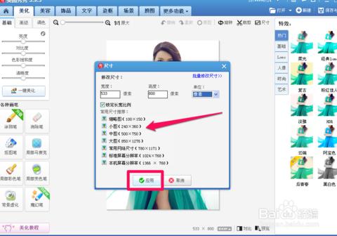 出现一个小窗口,选择自己需要的尺寸,再点击应用,小编就选择小图。