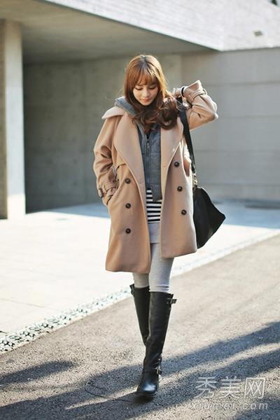 灰色的打底裤裙和长筒靴,可是冬季很流行的搭配方式,不仅让MM们穿出修长美腿来,而且保暖又不失时尚感,包臀裙款式的打底裤裙还显性感曲线呢。上半身混搭上打底衫和马甲,再加上驼色呢子大衣的搭配,冬季这样穿让MM们hold住时尚,变时尚达人呢! |