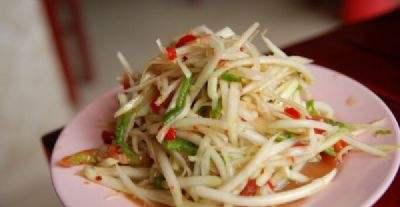 走进西双版纳傣族村寨,见得最多的要数木瓜树,竹楼前、篱笆旁都会栽种着成排的木瓜树,不仅可以起到绿化美化庭院的效果,更重要的是它还是制作傣家风味美食“舂木瓜”的首选原料。舂木瓜是一种美味菜肴。制作舂木瓜有两道工序。做法是先把木瓜剁成丝,然后把新鲜辣椒、西红柿、柠檬、盐、糖、味精、鱼露等放进石臼里,用石杵舂成糊状,再与木瓜丝拌合,酸、甜、辣、咸和带有鱼露特殊味道的舂木瓜便做成了。