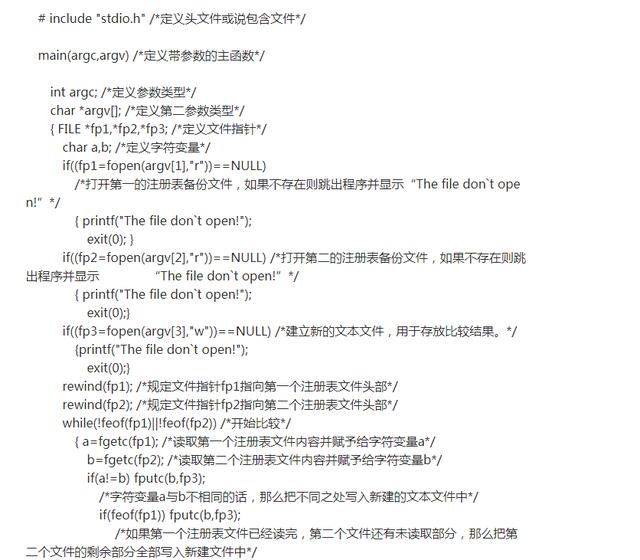 2.注意输出格式中“%”后的字符 C语言的输出说复杂不复杂,因为常用的都很简单。可说不复杂也未必,记得曾在一次等级考前辅导我们C语言的教授讲道:“如果C语言要考得很难的话,根本不用考什么指针,只要专考输出格式,我想百分之九十九的学生都不及格。”当时我们无不认同。从这则事例中可以看出C语言的输出格式之复杂程度。因此大家在学习它时千万要学会辨别输出格式中“%”后的字符,每个字符都有其意义,也都有其作用。 二.优先级 说道优先级,有很多朋友都不是很了解或说很模糊。为此笔者想先通过一个例子让各位有个概念。什么叫优先级?比方说,我们在公交车终点站排座队时总会遇到70岁以上的老人不需要排队就能上车的情景,这就是优先级的涵义。C程序在运行时也象排队坐车一样,首先照顾那些优先级高的运算符,若是优先级相同,那么就象遇到两位(或两位以上)70岁以上的老人那样,让他们依次上车。但是C语言中的优先级的运算并不是千篇一律的,只能说是在大多数情况下,有些运算符的优先级有其自己的特点,因此这点大家要注意。例如条件表达式:条件?结果1:结果2,这种表达式很多朋友都知道,它的作用与IF…ELSE…条件判断语句很雷同,它运算时的优先级就不是按照C语言的规则来完成的。所以说对于优先级各位编程爱好者一定灵活掌握,不要死记硬背。 三.指针 就个人认为,C语言中的指针是最有特色的,当然也是最难学的。指针说穿了,其实是变量的一种表现形式,只不过这种变量记载的不是数值而是地址。就象一个人可以用姓名来表示自己,也可以用身份证号码来表示自己一样。笔者涉足编程已经有三年多了,在这期间曾经收到过很多网友的电子邮件询问学习指针的方法。就本人感触,学习指针最好是先学些计算机硬件工作的原理,例如:直接寻址,间接寻址等,只有了解了这些内容以后,你再学指针就比较容易理会,毕竟C语言是一门介于机器语言与高级语言中间的语言,没有一些硬件工作知识是很难领悟它的真谛的。然而事事并非绝对,如果你没有这些知识也不要紧,只要清楚知道以下笔者总结的二点再加上多练习便可: 1.指针是地址变量:它的值有两种:其一是地址,其二是内容。不同的表达方式可以取不同的值,这有点象一个家庭地址在不同的场合标识的人物也不同。例如:父母亲在他们的单位所登记的家庭地址就代表他们自己,而你在学校中登记的同样的家庭地址就代表你自己。 2.指针是可以运算的,它的运算法则与变量是一致的。 另外,在编写一个程序时,除非万不得已,一般不要使用指针变量。因为指针是比较复杂的,用不好就“当机”。所以笔者建议各位对于指针只要能看懂就行,当然如果你是准备参加考试的就另当别论了。 四.函数 虽说很多程序语言都有函数这一内容,但笔者觉得C语言的函数是最有魅力的。如果你能完全掌握C语言的函数,那么学习C++就不成问题了(C++是一门建立在C语言上,但又不同于C语言的高级程序语言,它增添了很多函数。)。学习函数的方法是比较简单的,只有两个字“牢记”,即:牢记函数的功能,牢记函数的用途以及如何输入输出。有些朋友认为,程序语言中的函数没有多大用处,其实这并不正确,函数从本质上讲是一段通用程序,用它可以帮助我们节约很多编程的时间,一个聪明的编程者在编写程序前往往总是先找自己所编写的程序中有多少是可以用函数来代替的。笔者曾经作过一个比较字符串的实验,用C语言中的strcmp()函数只要一句话,而自己编写的话30句话都摆不平,可想而知函数是多么实用呀! 写到这里笔者该告一段落了,下面送一个本人自己用C 语言编写的注册表比较程序给诸位。此段程序的注释请看“/*…*/”后的文字,程序运行时(在DOS模式下)输入的方式如下:compare xx1.reg xxx2.reg xxx3.txt,注意字段与字段之间是有空格的。(compare是程序名) 程序代码: