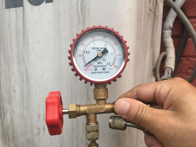 将氟罐和压力表连接好,压力表的另一端与低压接口虚接。打开氟罐与压力表,直到虚接部位冒“白雾”,快速将低压接口拧死,排空气结束。