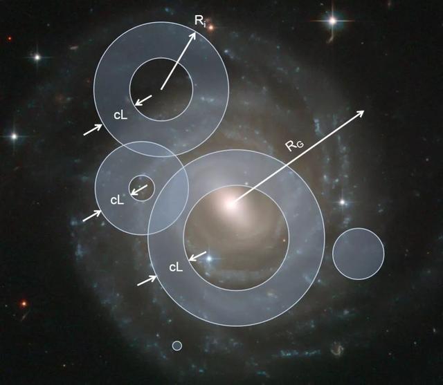 2017年在康奈尔大学演讲的天体物理学家弗兰克·德雷克。维基百科 德雷克方程考虑了几个方面的因素。它们分别是银河系的恒星形成率(R*),恒星拥有行星的比例(fp),适于生命繁衍的行星数量(ne),演化出生命的行星数量(fl),演化出智慧生命的行星数量(fi),演化出拥有无线信号传输技术的文明数量(fc),以及这些文明向宇宙空间进行无线信号扩散的时间长度(L)。将这些变量相乘后,就得到了银河系中可能存在的智慧文明数量。这个方程是这样的: N=R*×fp×ne×fl×fi×fc×L Claudio Grimaldi等人基于这个方程,假设其中的N,也就是银河系中文明的数量会恒定在一个值,而且它们能够进行无线信号扩散的时间,也就是L是有限的。 Grimaldi为此专门解释道,“我们假设这样的文明在一段有限的时间内,会朝着宇宙空间的所有方向输出等量信号(这里指的信号扩散,并不是特指有目的的信号发送,而是指许多无意间泄露到太空中的信号),且这种信号的产生率是恒定的。每一个信号输出过程都会产生一个厚度为cL(c为光速)球状‘泡’,泡内充满了电磁波。这个‘信号泡’的外半径会以光速扩张。” 也就是说,我们假设高度发达的技术文明在银河系中出现和灭亡的速率是恒定的,它们能够进行无线通信的时间并不是永恒的。但是它们所产生的信号,仍然能够以光速在宇宙中扩张。因此它们产生的信号仍能够在一定的空间范围内被发现。根据这些条件,科研小组建立了一个银河系模型,以明确人类是否有机会检测到这些信号。 模型显示,外星通讯信号会在三维空间里,以一种近似于圆环的结构,穿越星系。