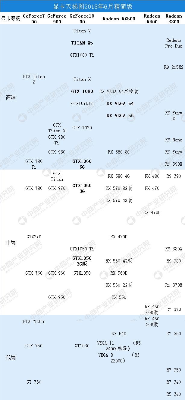 显卡又称为显卡适配器,是计算机非常重要和最基本配置的配件之一。显卡作为电脑主机的核心部分,主要作用在于提高更好的画质和图像,保障好的显示图像。 就目前来说,显卡分为核心显卡和独立显卡,对于DIY装机用户来说关心最多还是独立显卡,尤其是游戏和设计类用户,选购一款好的显卡显得非常重要。我们选购显卡非常关注的就是显卡品牌,我们都知道好的显卡品牌决定了配件的质量和品质、性能等等,往往好的大品牌自然在稳定性方面更有保障。 显卡是游戏电脑最核心的硬件,大多数游戏对显卡的要求比CPU都高,独显平台如今只剩下NVIDIA和AMD两家,但产品型号众多。 以下为2018年6月最新版显卡天梯图: