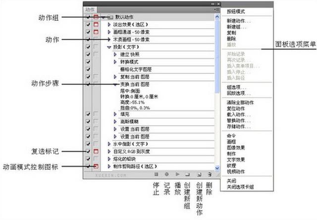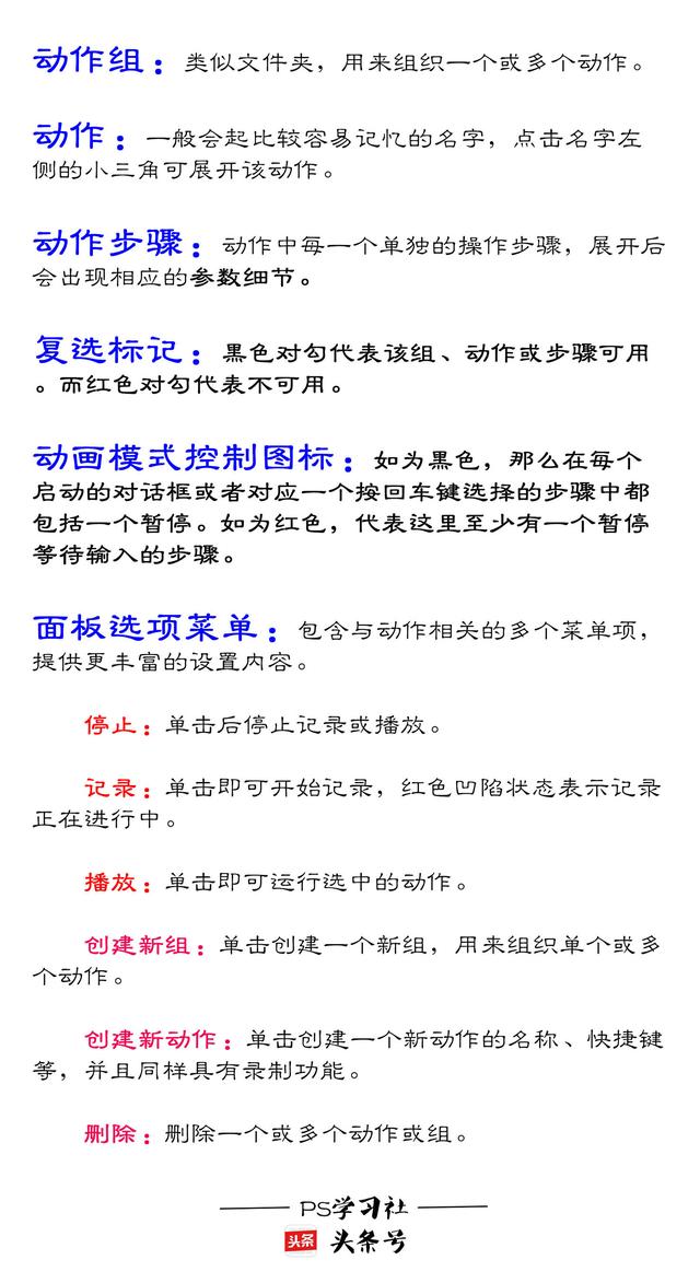 动作面板构成 第四:动作面板相关名词解释详细解释参考下图