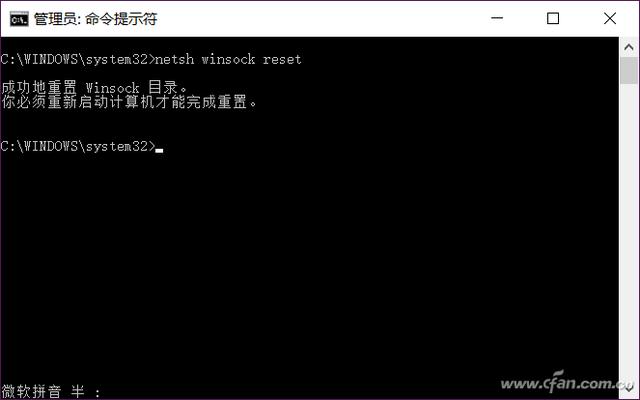 如果发现网页还是不能登录,请再来一条命令,输入netsh winsock reset回车,这个命令可以重新初始化网络环境,包括IP地址、DNS、网卡等等。需要注意,netsh winsock reset输入完毕后,必须重启一次电脑。