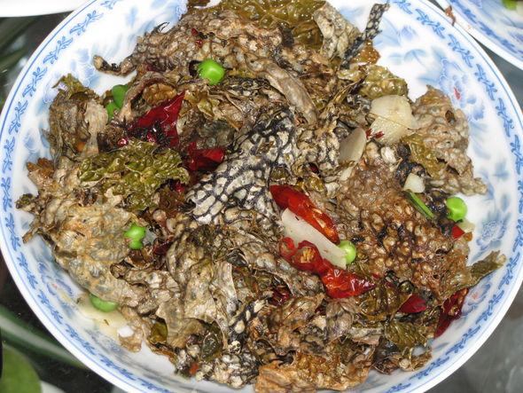 青蛙皮也称树蝴蝶,味淡、性平、口感初尝时略苦,越嚼越香,像木耳但比木耳要硬脆,也有点像炒熟的鱼皮,与鲜肉爆炒,爽脆而有嚼头。树蝴蝶食用时,应该是先清洗好,再在沸水中滚上片刻,然后捞出,漂洗,就可以炒、炖、凉拌了,做出来的菜鲜美清爽,山野味十足。