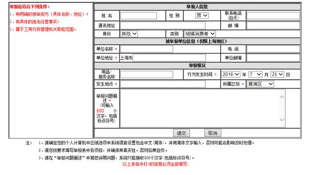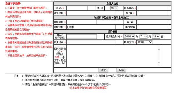 我们以投诉为例,点击投诉填写表格,会出现下面一张表格,请按照要求如实填写。一定要记住的是,填写完成后拍照或者截屏。