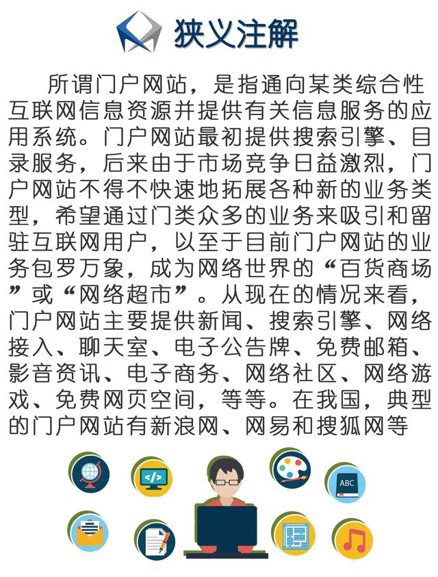 门户(portal)。原意是指正门、入口,现多用于互联网的门户网站和企业应用系统的门户系统。