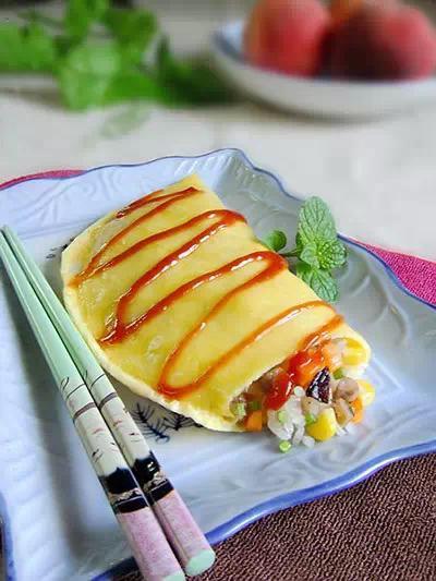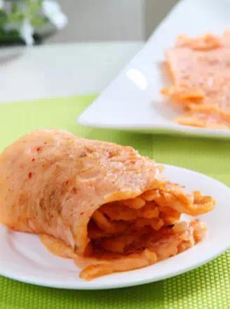 主料:辣白菜200克、鸡蛋1个、面粉150克; 辅料:植物油15克、食盐3克、白芝麻10克; 做法: 1.准备面粉、辣白菜、白芝麻; 2.辣白菜剁碎; 3.面粉里加入一个鸡蛋,加入水和成面糊,加入剁碎的辣白菜和少许盐; 4.锅内放少许底油; 5.把面糊摊入锅内,撒上白芝麻; 6.两面变色为止即可。 烹饪技巧: 辣白菜的汤也不要扔掉,到面粉里,颜色更漂亮,口味更浓郁哦。 午餐:饺子蛋包饭