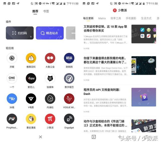 轻应用 从去年年中推出的 v2.0 版本开始,夸克加入了轻应用的功能,将一些在垂直领域颇有人气和观点的社区网站重新封装,打包成轻应用。从整体的效果来看,夸克的轻应用在阅读体验上还是有一定的提升效果,这点对资讯类网站尤其明显,内容排版去除了恼人的广告以及其他无关元素,同时在打开速度上也有不错的表现。但是,轻应用仍然缺乏调整文字大小选项、夜间模式下对比度下降导致内容阅读出现「看不清晰」的问题。