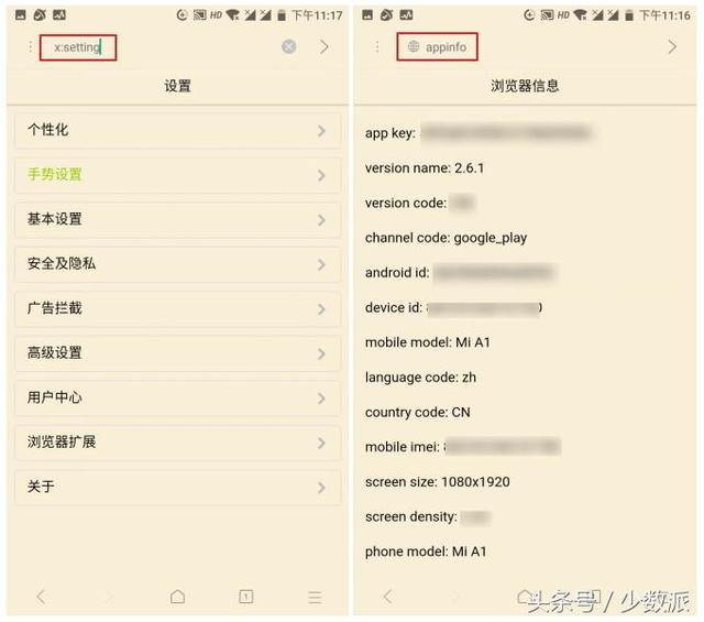 有趣的地址栏命令 与 Chrome 类似,X 浏览器支持在地址栏输入 x: 开头的特定代码,直接打开相应的功能:设置、历史记录、书签等,比如输入 x:setting 即可打开浏览器的设置页面。其他命令还包括了 x:as、x:custom、x:gs、x:adb、x:me、x:addon、x:info,尝试输入以上的命令,探索更多的便捷操作。