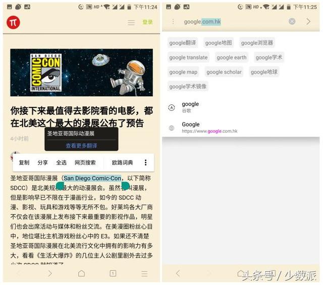 即时翻译和即时词典 X 浏览器提供了常规的网页全文翻译功能(使用百度翻译),在此基础上还带来了即时翻译和即时词典,其中即时翻译是在长按选择网页的单词时浏览器界面立刻显示翻译结果,即时词典则扩展了地址栏功能,用户输入单词时将看到翻译结果在备选项中。