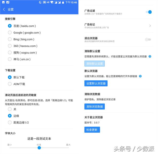 有趣的一级菜单设置页 如果厌倦了浏览器多级菜单的设置项,开关某个功能时需要打开多级路径。星尘浏览器的设置项摒弃了多级菜单,仅仅保留了一级菜单,将全部功能开关项放置在一个页面,方便用户更加直观地了解浏览器究竟提供了哪些功能选项。