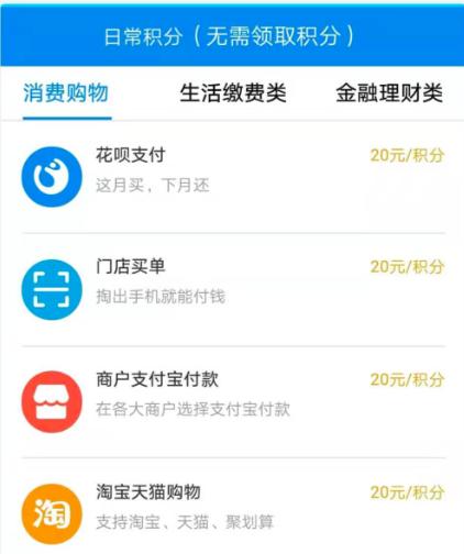 购物、花呗付款都能产生支付宝积分有很多网友好奇,怎么样才能产生支付宝积分呢?是不是一定要会员? 其实,只要你在支付宝账号里注册账户,每天签到,就能获得一定的积分。而且当你签到7天以上,之后每天坚持签到,每天都能获得7分的积分。 另外,你在淘宝上购物,线下门店买单,打车出行,用花呗付款,刷支付宝坐地铁,乘公交车都可以获得相应的积分。 虽然每次获得的积分只有1分或者4、5分,但支付宝使用这么刚需,一个月还是能轻轻松松获得上千积分的,我上个月就获得了2700积分。
