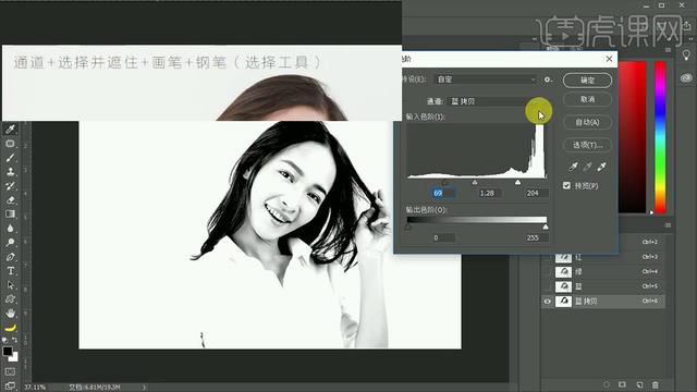 首先分析‘如何抠图’打开【通道面板】【复制一层蓝色通道-CRTL+L调整色阶】。 1、首先分析‘如何抠图’打开【通道面板】【复制一层蓝色通道-CRTL+L调整色阶】。