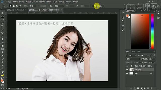 6、【CTRL+ENTER路径转化为选区】【CTRL+J复制一层】【隐藏原图层+头发图层】观察效果。