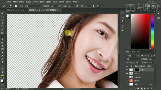 7、【关闭背景层】观察画面整体效果,在【头发图层的蒙版上使用画笔涂抹】恢复细节。